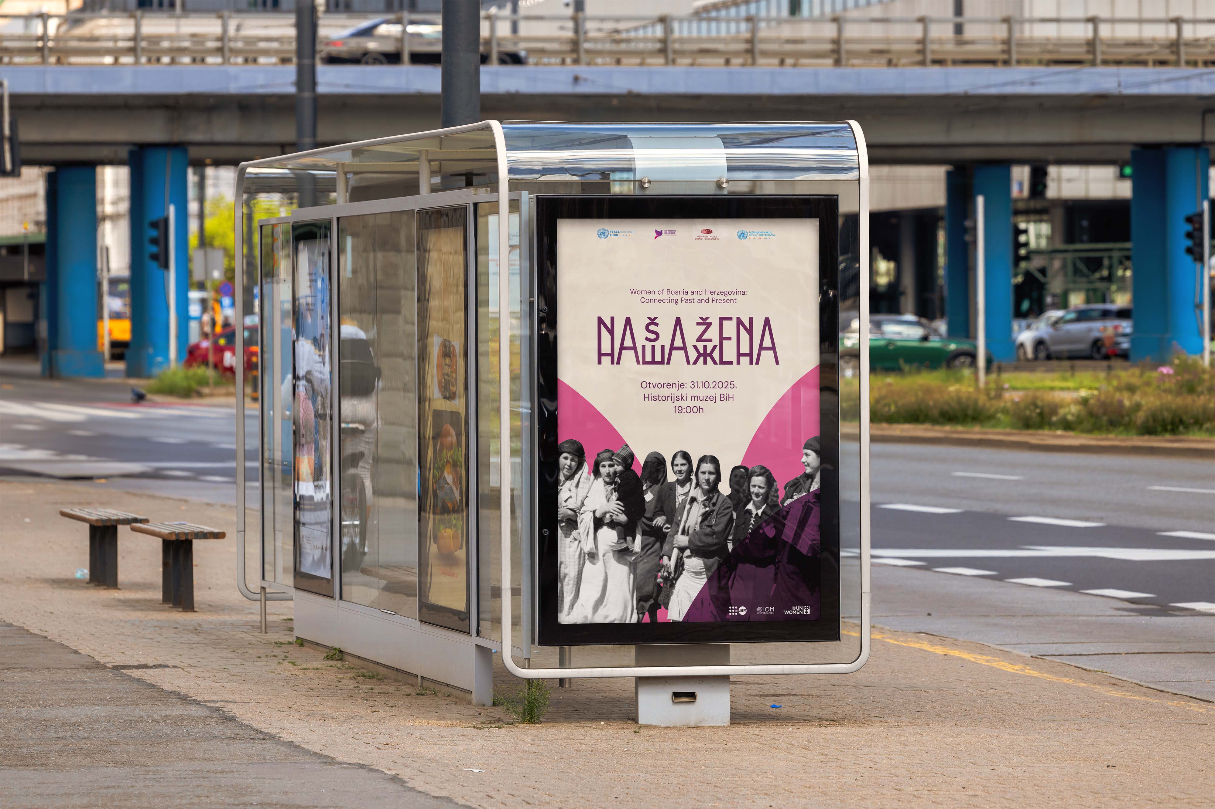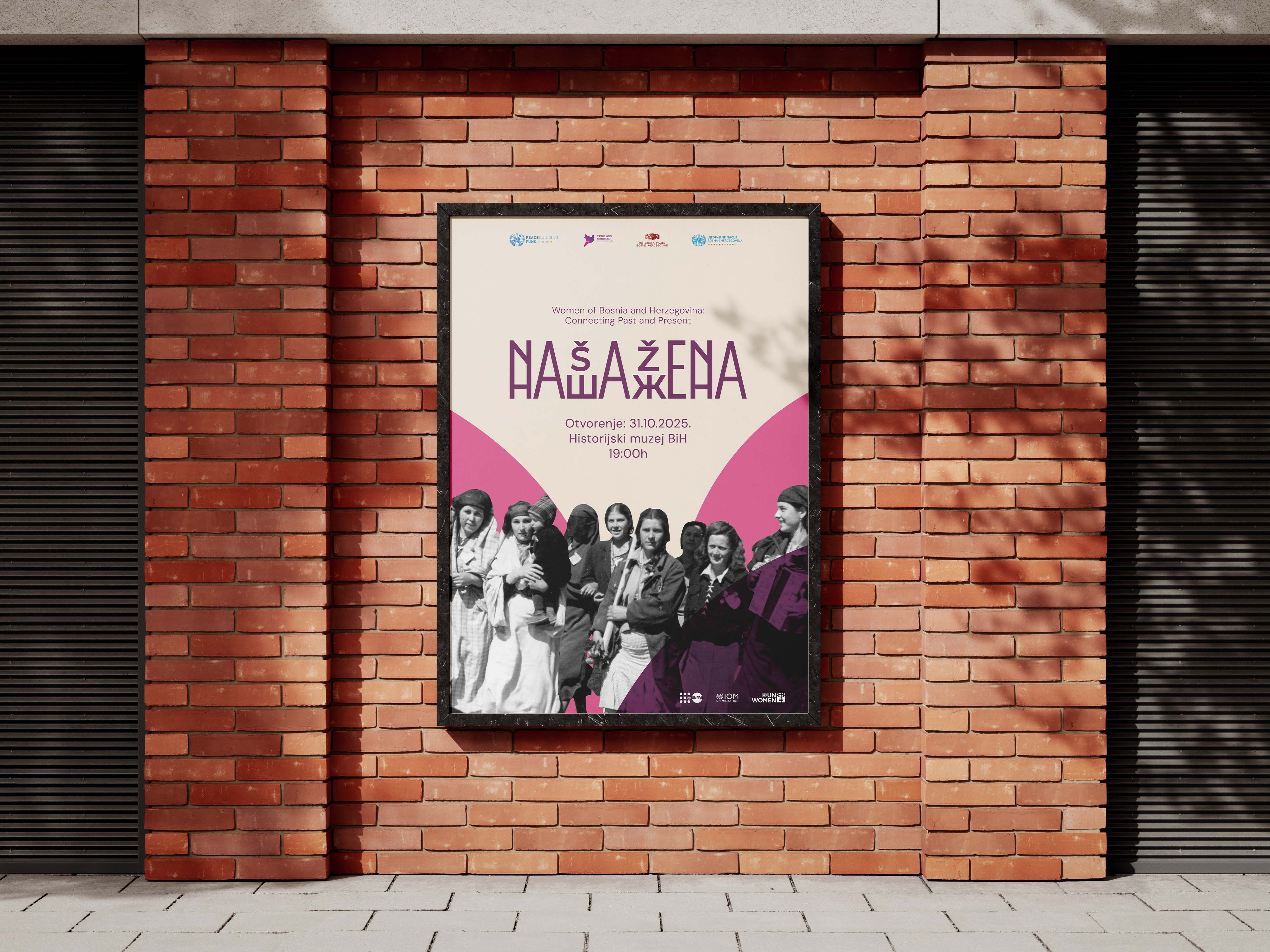 The visual identity combines Cyrillic and Latin scripts into a single typographic symbol forming the title Naša žena, representing unity and shared experience across different regions and communities in Bosnia and Herzegovina.
